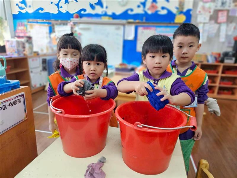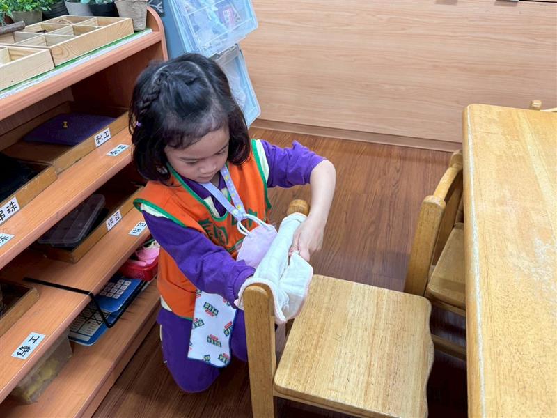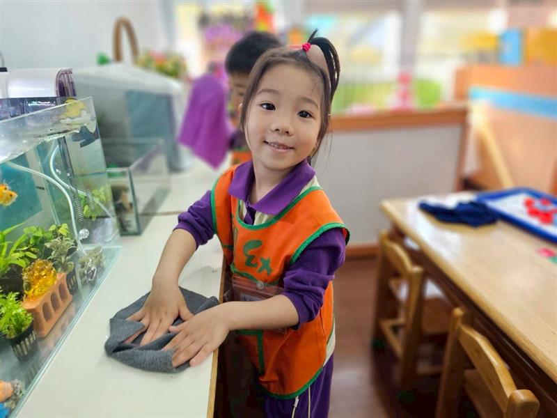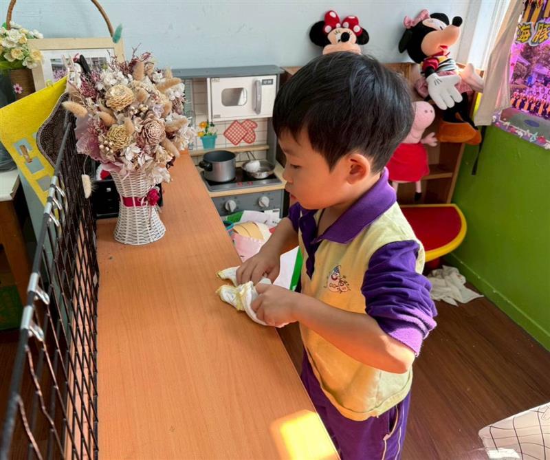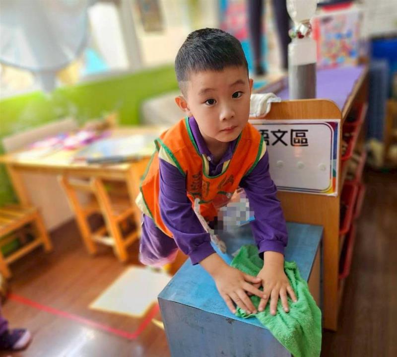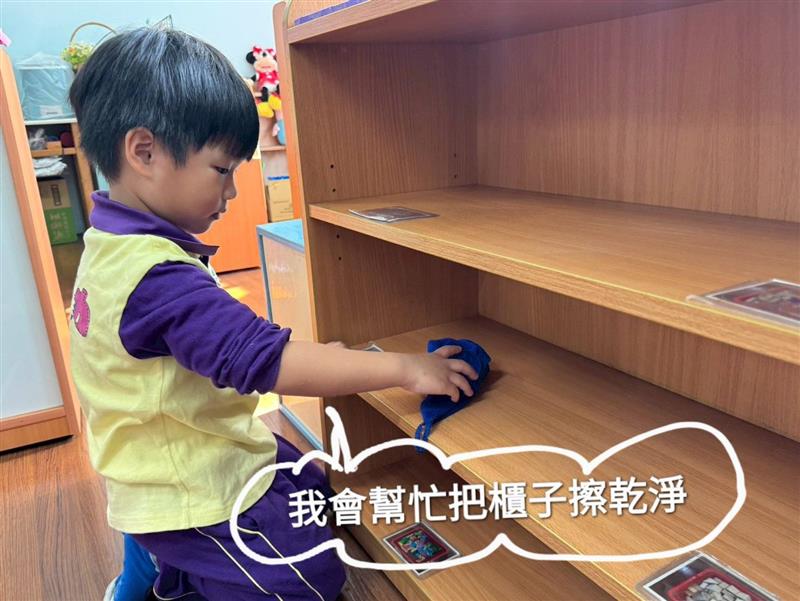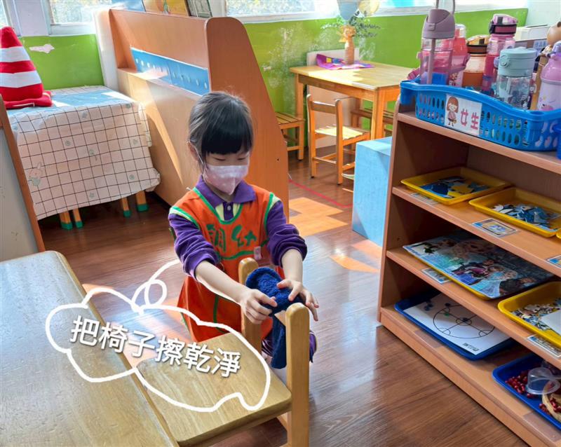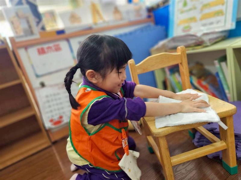 看著寶貝們捲起袖子,不管是練習擰乾抹布、仔細擦拭櫃子深處,還是認真清潔自己的小椅子,每一個動作都充滿了責任感。