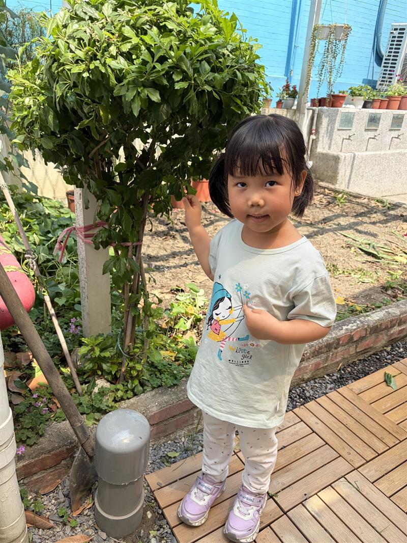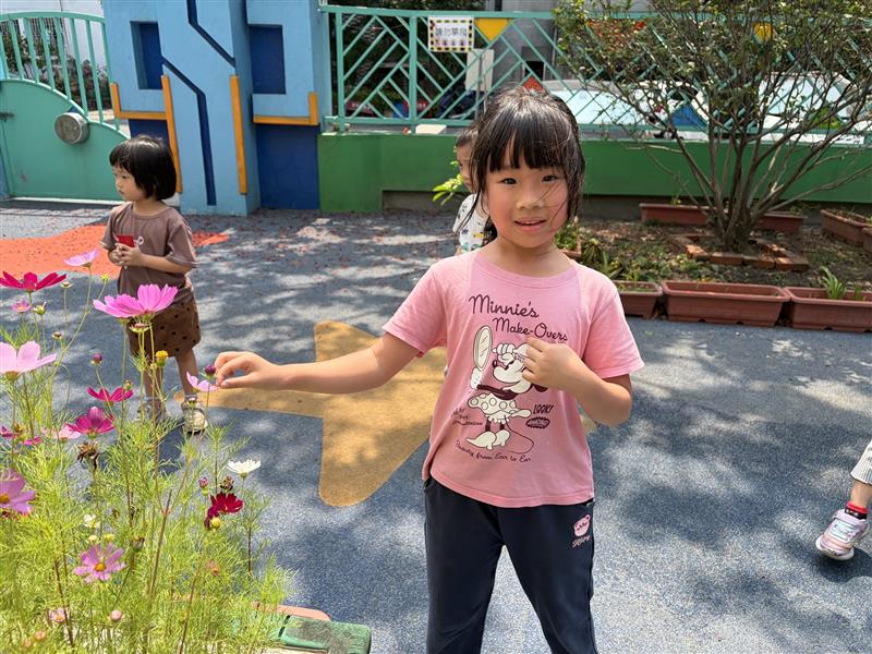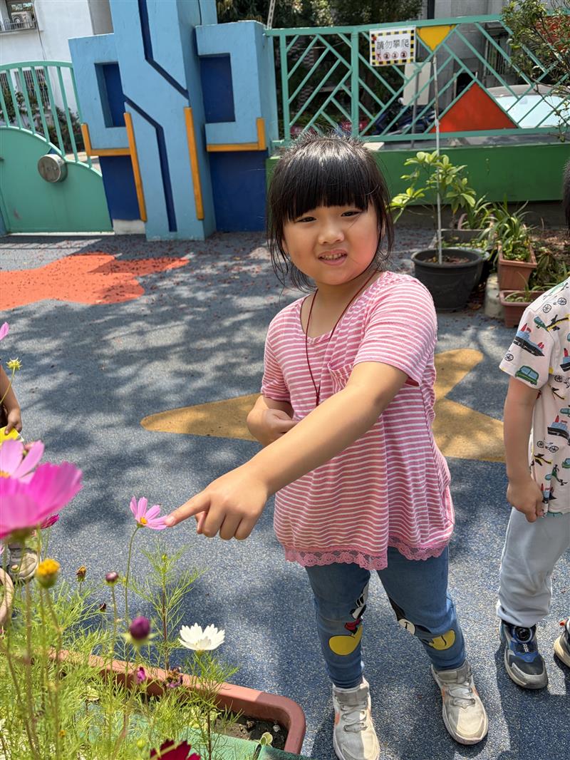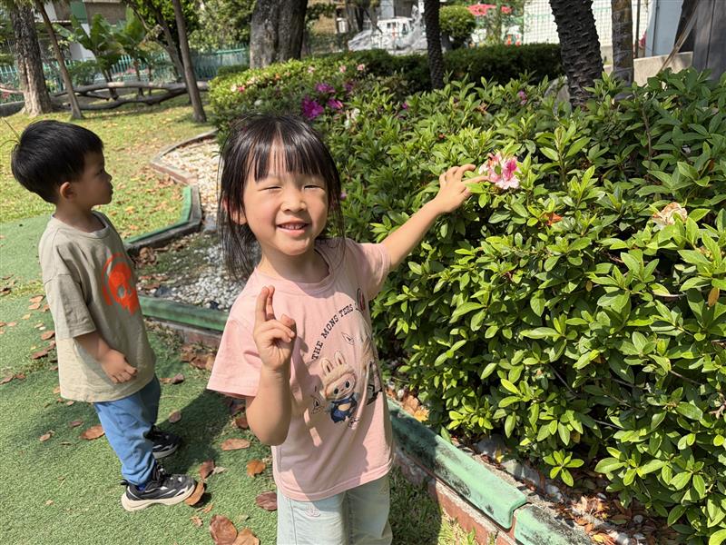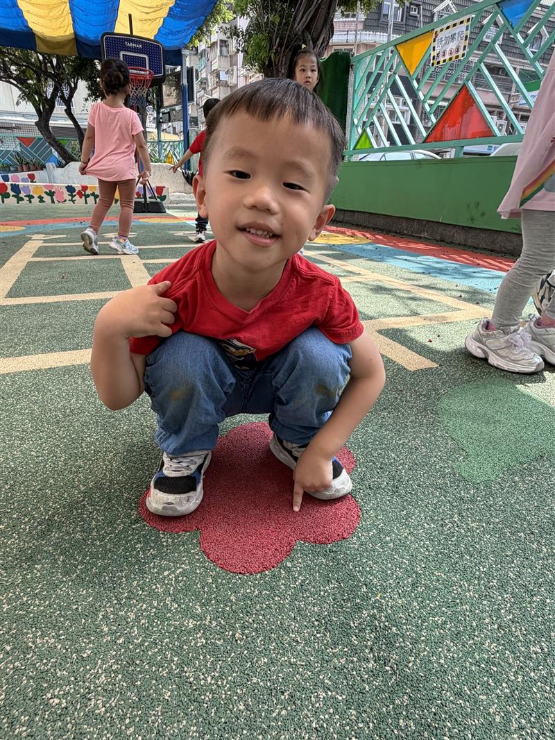 活動一開始,老師請幼兒觀察自己當天穿著的衣服顏色,說一說自己的顏色是什麼,作為活動的出發點。接著再帶領幼兒至校園中進行探索活動,請幼兒依照自己衣服的顏色,尋找環境中相同或相近的顏色,例如:紅色的花、綠色的植物、藍色的遊樂設施⋯⋯⋯等,幼兒可透過指認自己的衣服跟找到的顏色,進行辦認,加深對顏色的概念,之後老師也將孩子們發現的顏色,跟自己進行拍照,讓孩子們可以加以記錄。